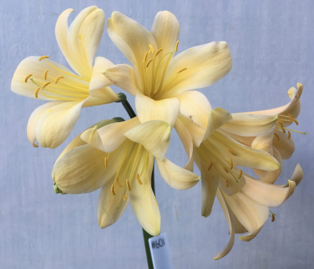 SH601 Light peach Clivia miniata with yellow blush and slightly re-curved petals