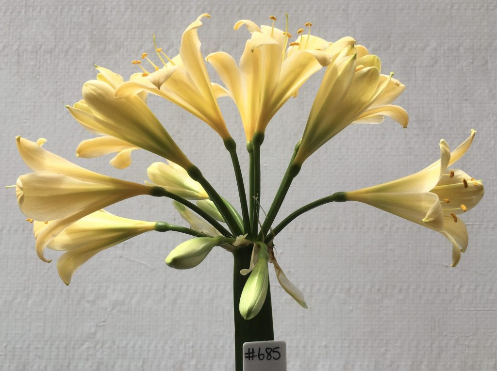 SH685 Cream/yellow Clivia miniata with very light peach tones and green throat
