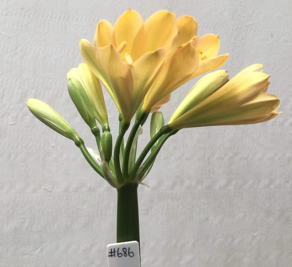 SH687 Very light peach Clivia miniata with rich green throat and slight re-curve...