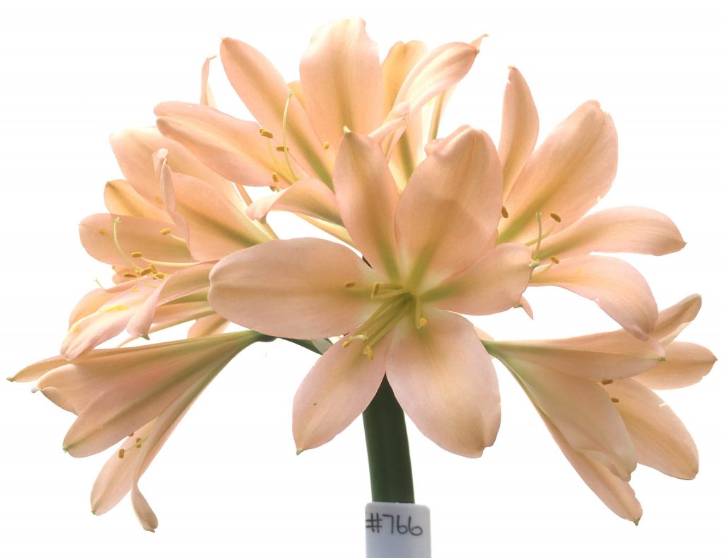 SH766 Strongly pinky peach Clivia miniata with light green throat and slight recurve
