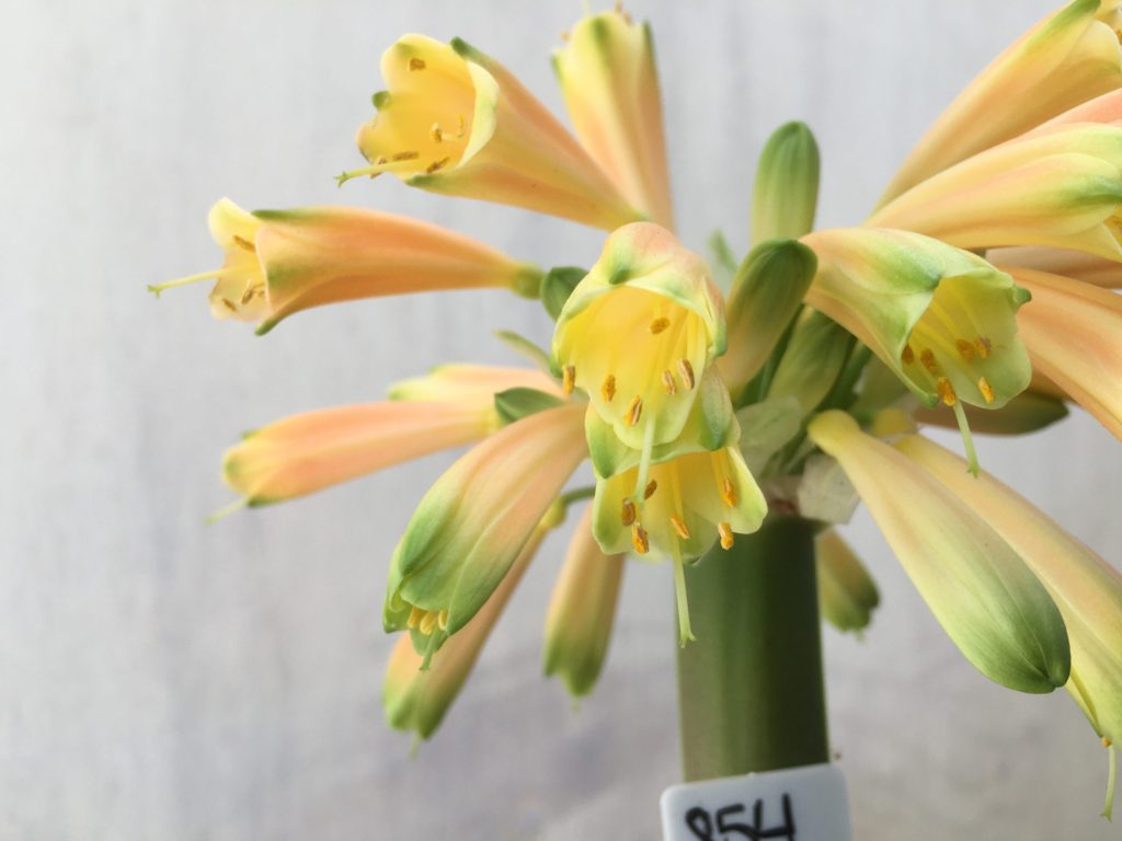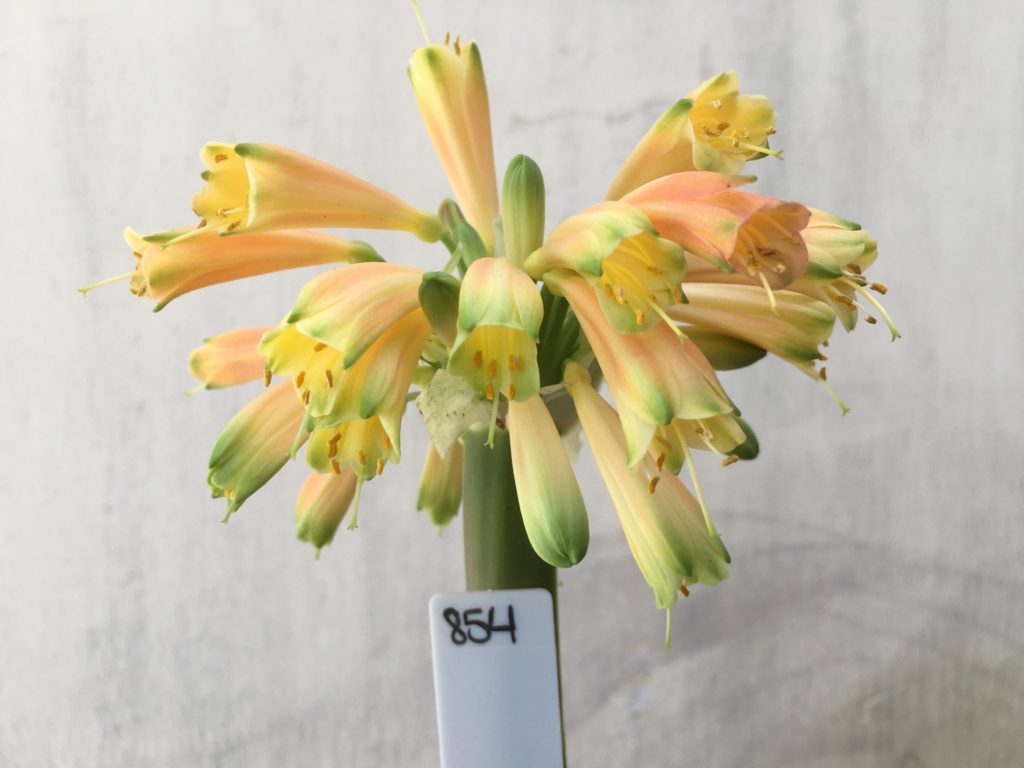 SH854 Clivia Interspecific having numerous cream sepals which fade to light orange and partially green tips