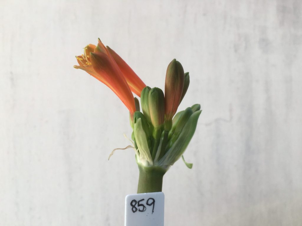 SH859 Clivia Interspecific with burnt orange sepals, green tips and dark orange throat