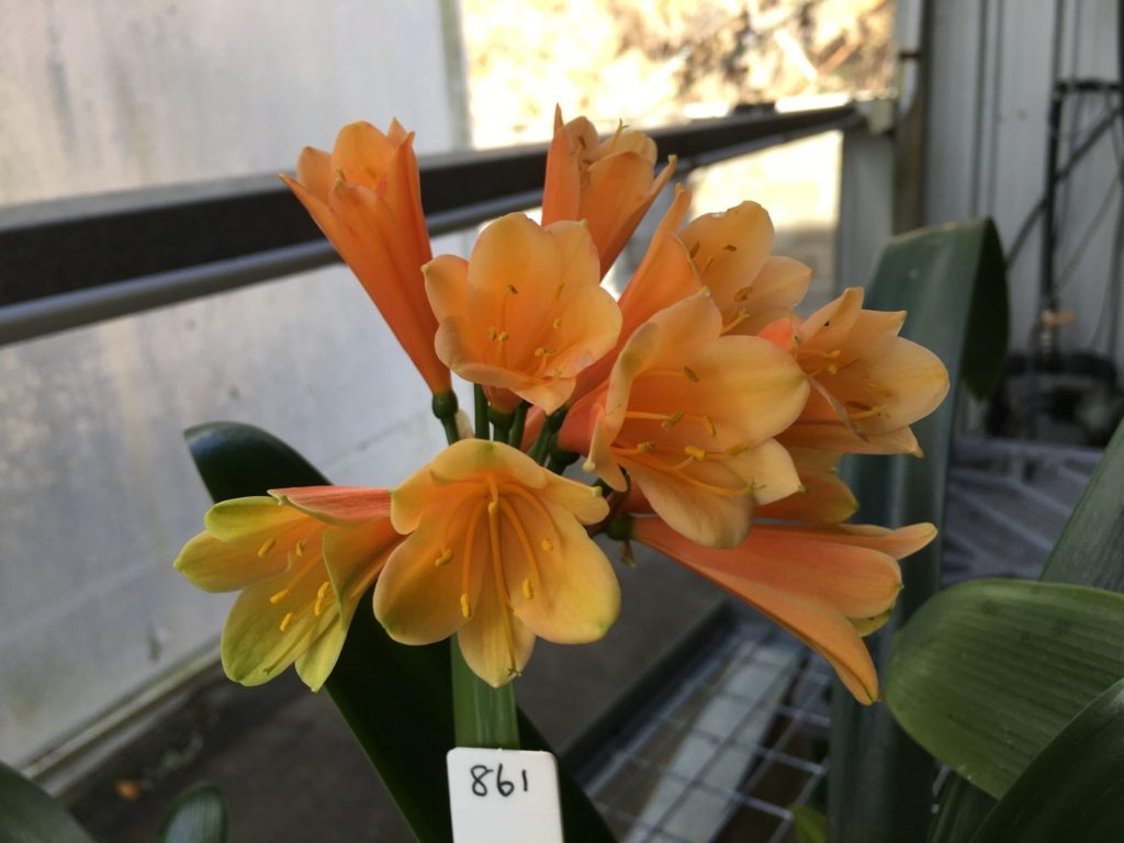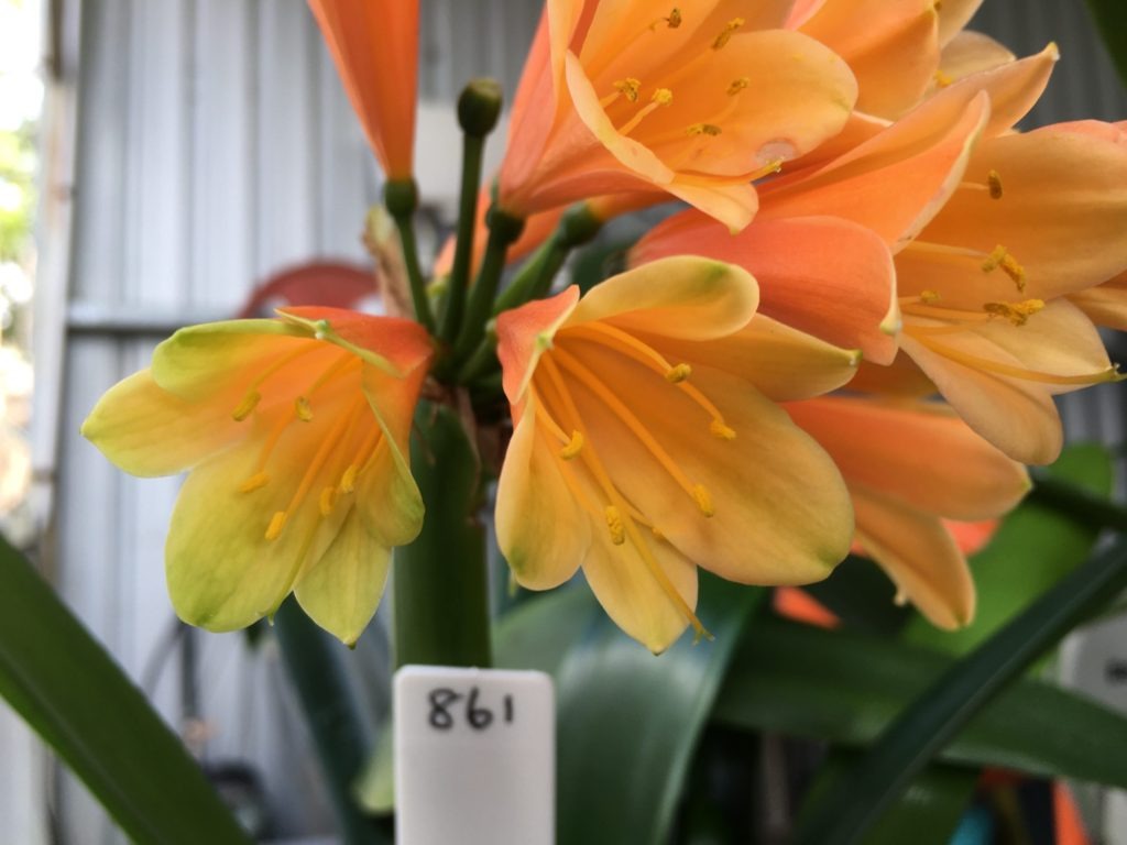 SH861 Clivia Interspecific with dark burnt orange sepals having green tips and orange/green throat