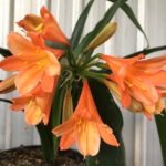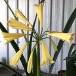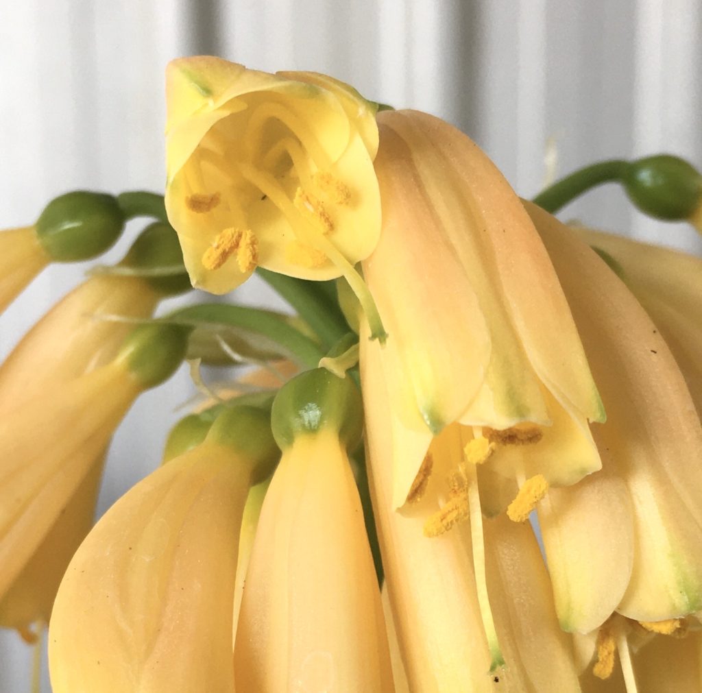 SH874 Pendulous Clivia with solid cream/yellow flowers terminating in small green tips and both Stigma and Anthers appearing outside the flower throat